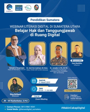 Rangkaian Webinar Literasi Digital di Kabupaten Deliserdang, Provinsi Sumatera Utara akan kembali bergulir. Pada Jumat (31/3) pukul 09.00-11.00 WIB, akan dilangsungkan Webinar bertajuk tema “Belajar Hak dan Tanggungjawab di Ruang Digital”.