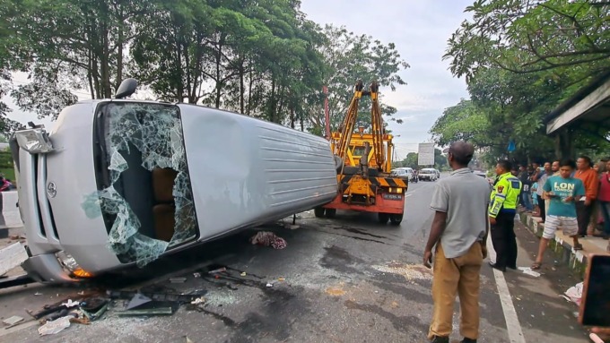 Mini bus Trans Travel Tiomaz BK 7703 DP terbalik usai menabrak pembatas jalan di depan Rumah Sakit Pamela Jalan Sudirman Kelurahan Sri Padang Kecamatan Rambutan Kota Tebingtinggi, Senin (1/5) pagi.
