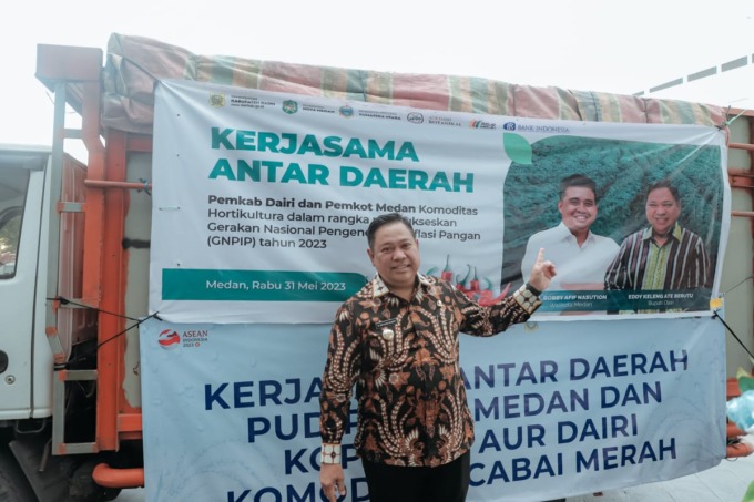 Bupati Dairi, Eddy Keleng Ate Berutu bersama bupati dan wali kota se-Sumatera Utara, menghadiri pertemuan High Level Event (HLE) Gerakan Nasional Pengendalian Inflasi Pangan (GNPIP) Tahun 2023 di Aula Raja Inal Siregar, Kantor Gubsu, Rabu (31/5/2023). Acara dirangkai dengan pelepasan secara simbolis hasil komoditi pertanian dari beberapa daerah, termasuk Dairi, oleh Gubsu, Edy Rahmayadi.
