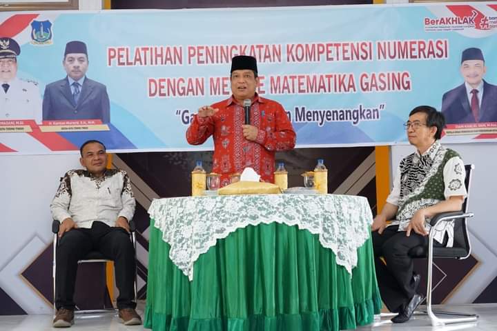 Pj Wali Kota Tebingtinggi Drs Syarmadani, didampingi Kadisdikbud Idam Khalid menghadiri acara Pelatihan Peningkatan Kompetensi Numerasi Dengan Metode Matematika Gampang, Asyik, Menyenangkan (Gasing) di ruang Laboratorium Terpadu Jalan Gunung Leuser BP7, Kecamatan Rambutan, Kota Tebingtinggi, Sabtu (24/6/2023).
