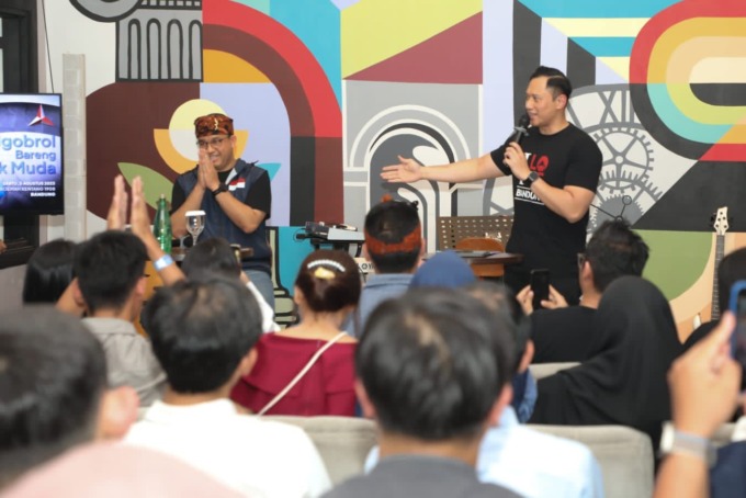 Ratusan anak muda menyambut meriah kehadiran Ketua Umum Partai Demokrat Agus Harimurti Yudhoyono (AHY) dan bakal Capres Koalisi Perubahan untuk Persatuan Anies Baswedan, di Bandung (5/8). AHY dan Anies hadir untuk ngobrol bareng anak-anak muda soal berbagai isu perubahan dan perbaikan yang menjadi perhatian mereka.