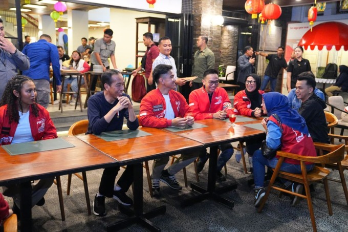 Presiden Joko Widodo (Jokowi) minum teh bersama putra bungsunya yang juga Ketua Umum Partai Solidaritas Indonesia (PSI) Kaesang Pangarep di Bandung, Jawa Barat. Mereka berbincang bersama dengan kader PSI sekira 1,5 jam.