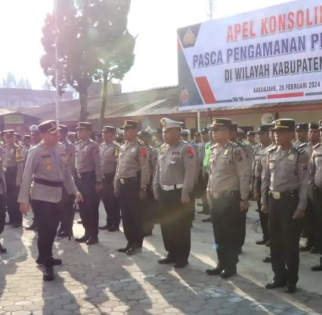 Kapolres Tanah Karo AKBP Wahyudi Rahman, SH, SIK, MM memimpin Apel Konsolidasi pasca pengamanan Pemilu 2024 di wilayah Kabupaten Karo. Apel ini dilaksanakan di lapangan Mapolres Tanah Karo, Senin (26/2) pagi.